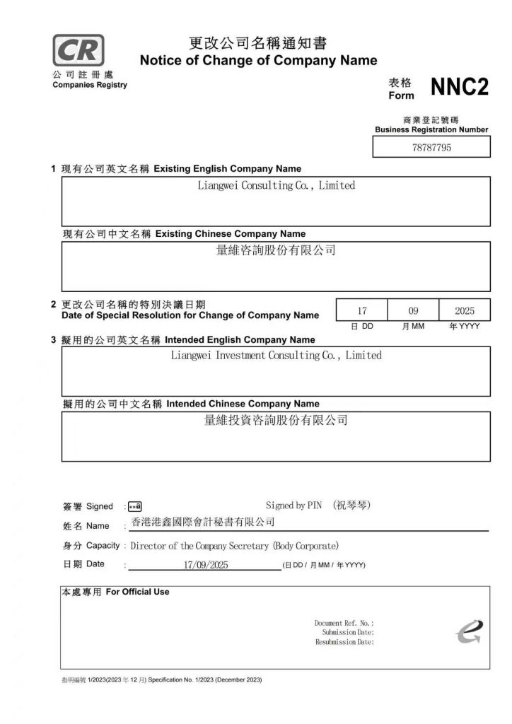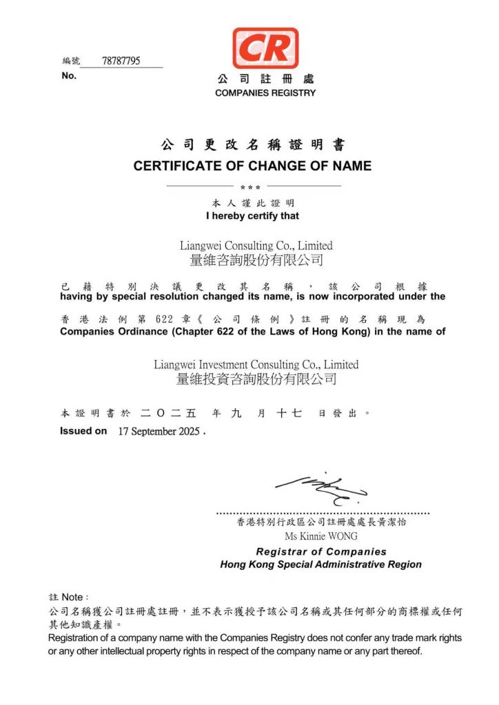 其前身为量维咨询股份有限公司,为契合 “专注人工智能算力在投资领域的研发与应用” 这一全新战略方向与业务核心,于 2025 年 9 月 17 日经特别决议正式更名,且该更名已获香港公司注册处核准(证书编号:78787795,由处长签署生效),向市场传递出从传统咨询向 “科技 + 金融” 深度融合领域进军的决心。
